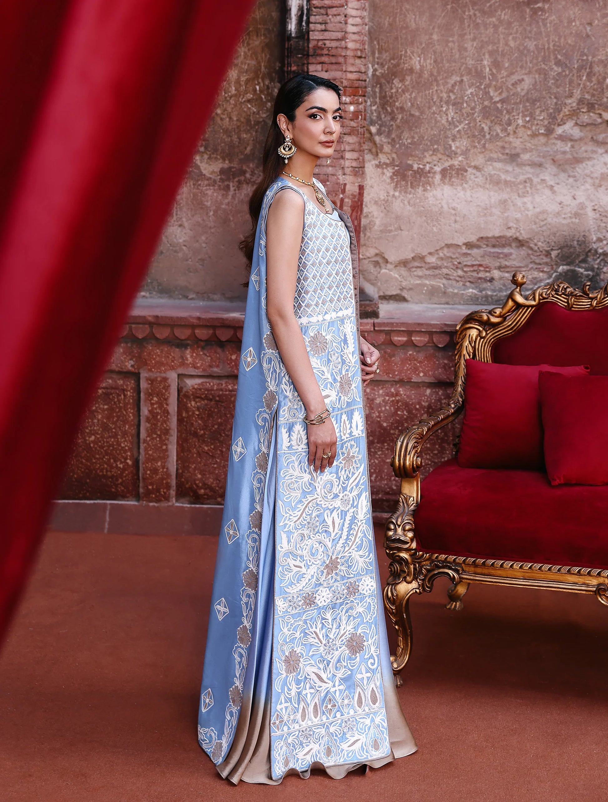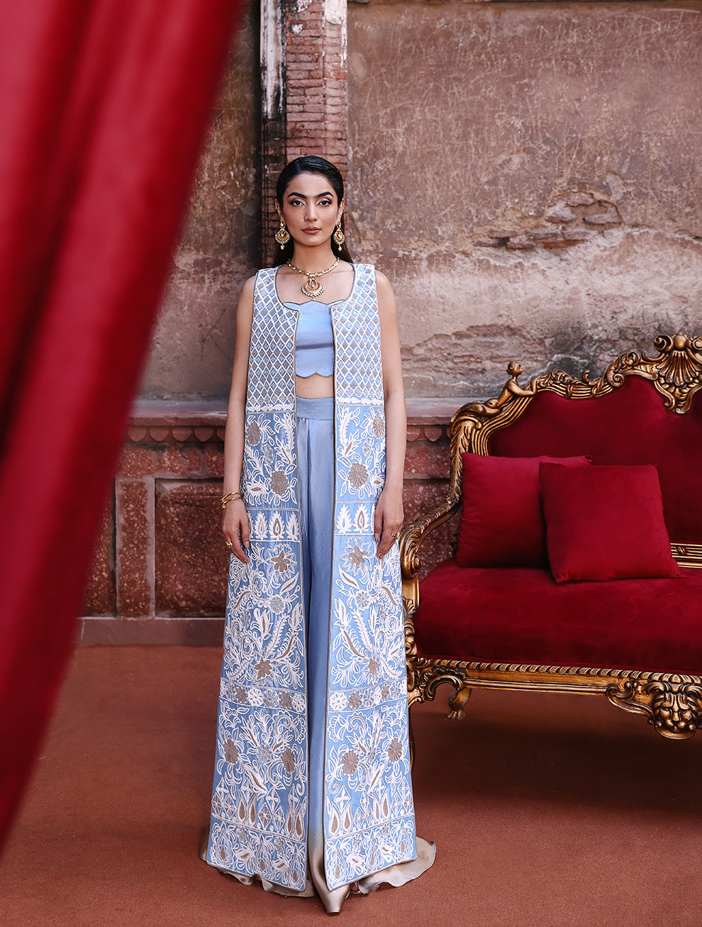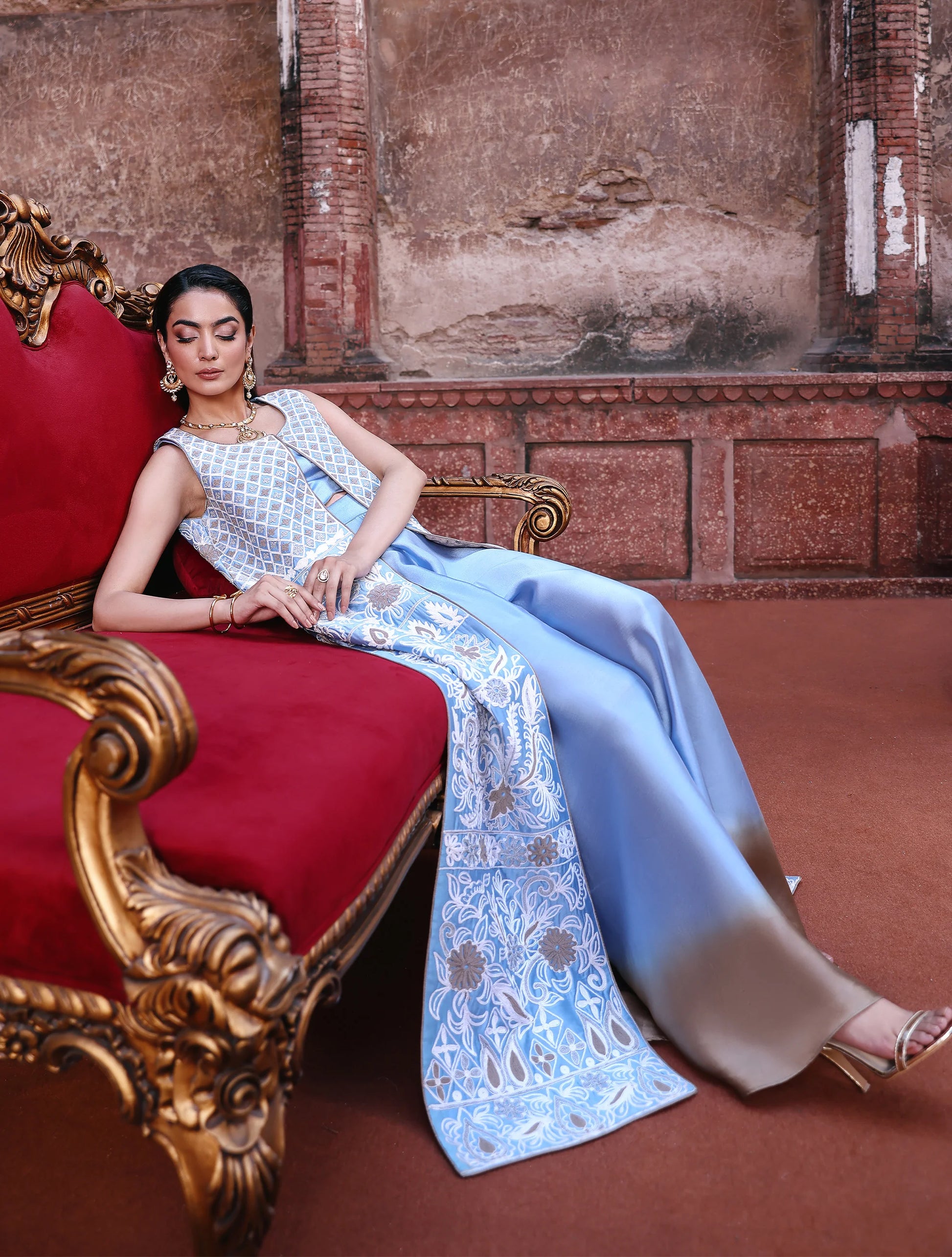 Bluewood crafted from premium silk, this elegant long silhouette is adorned with intricate ivory and brown dori work and tilla detailing, paired with flared pants to create a look that exudes timeless sophistication and modern charm.