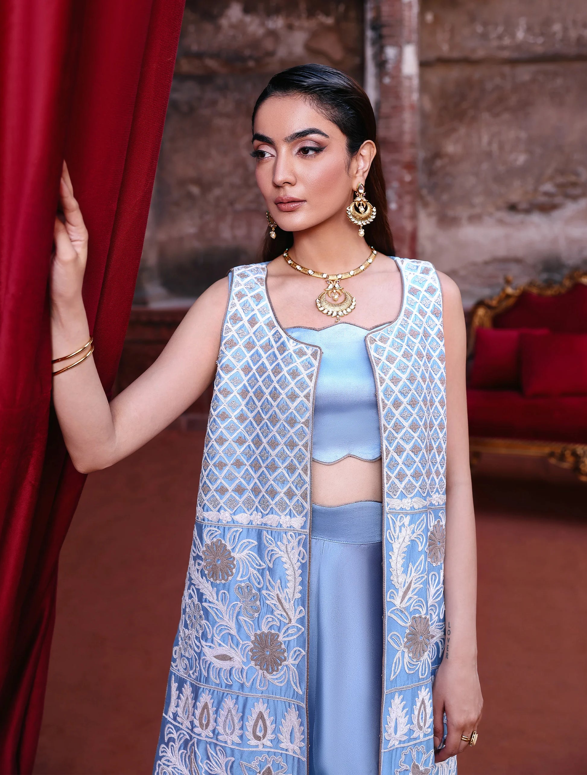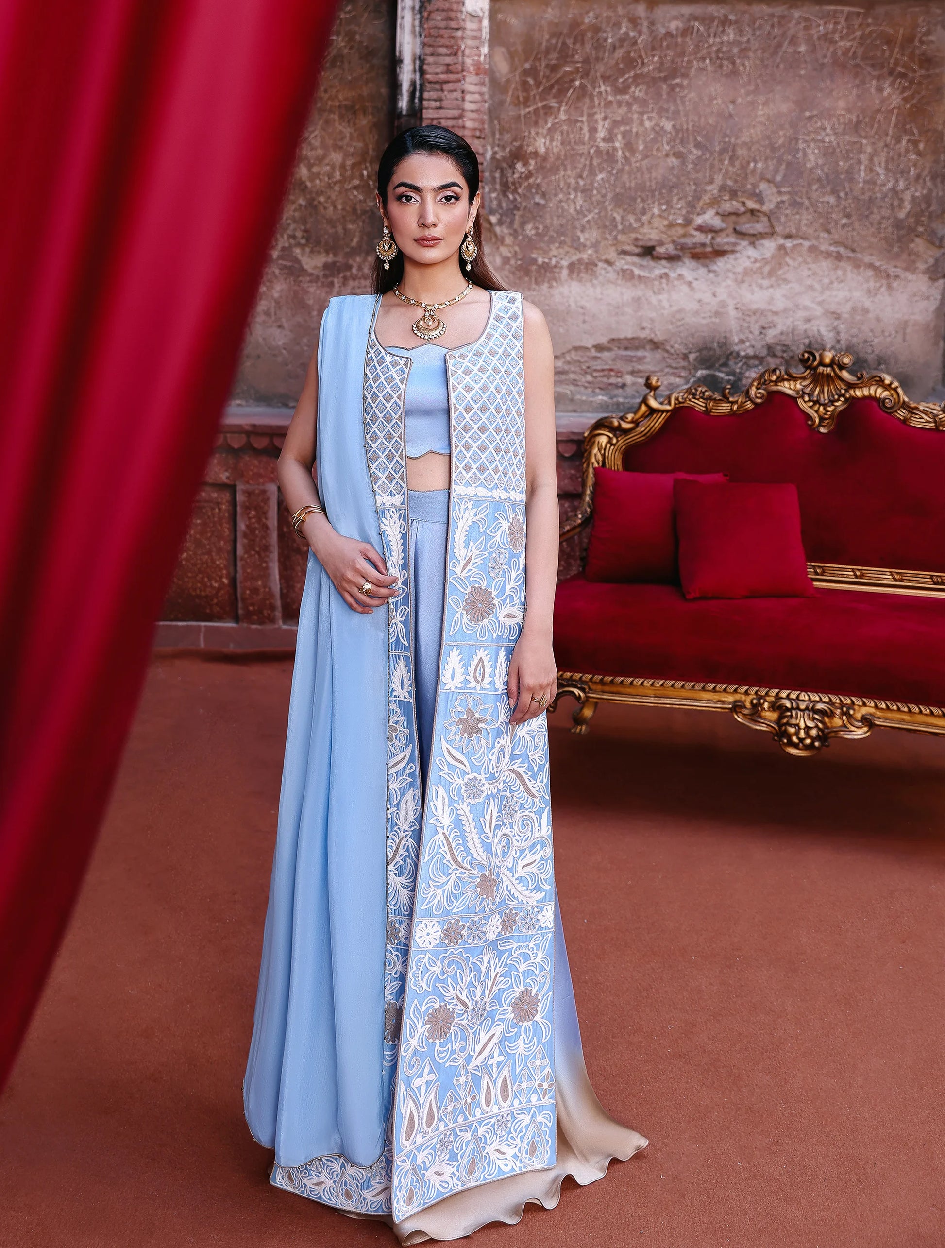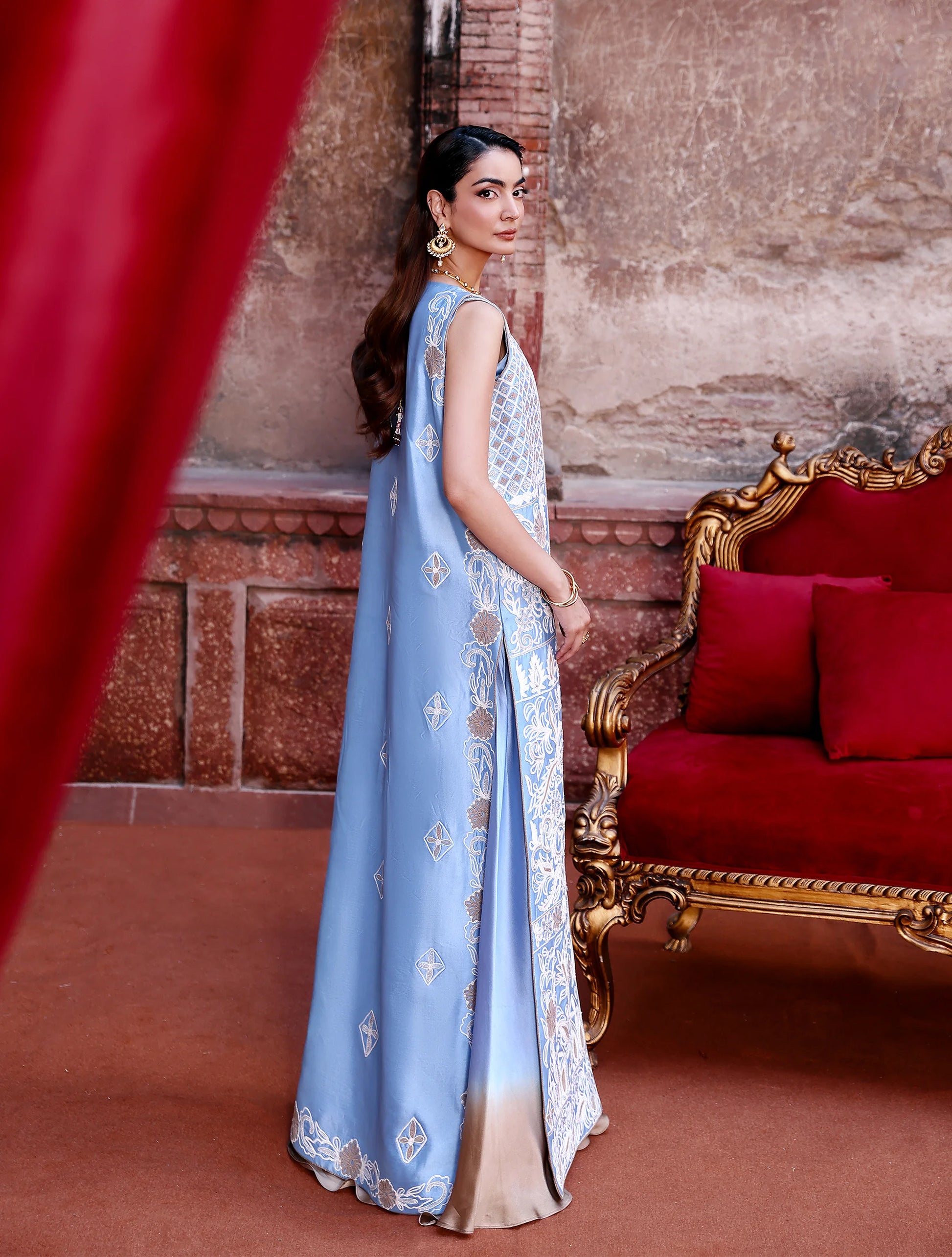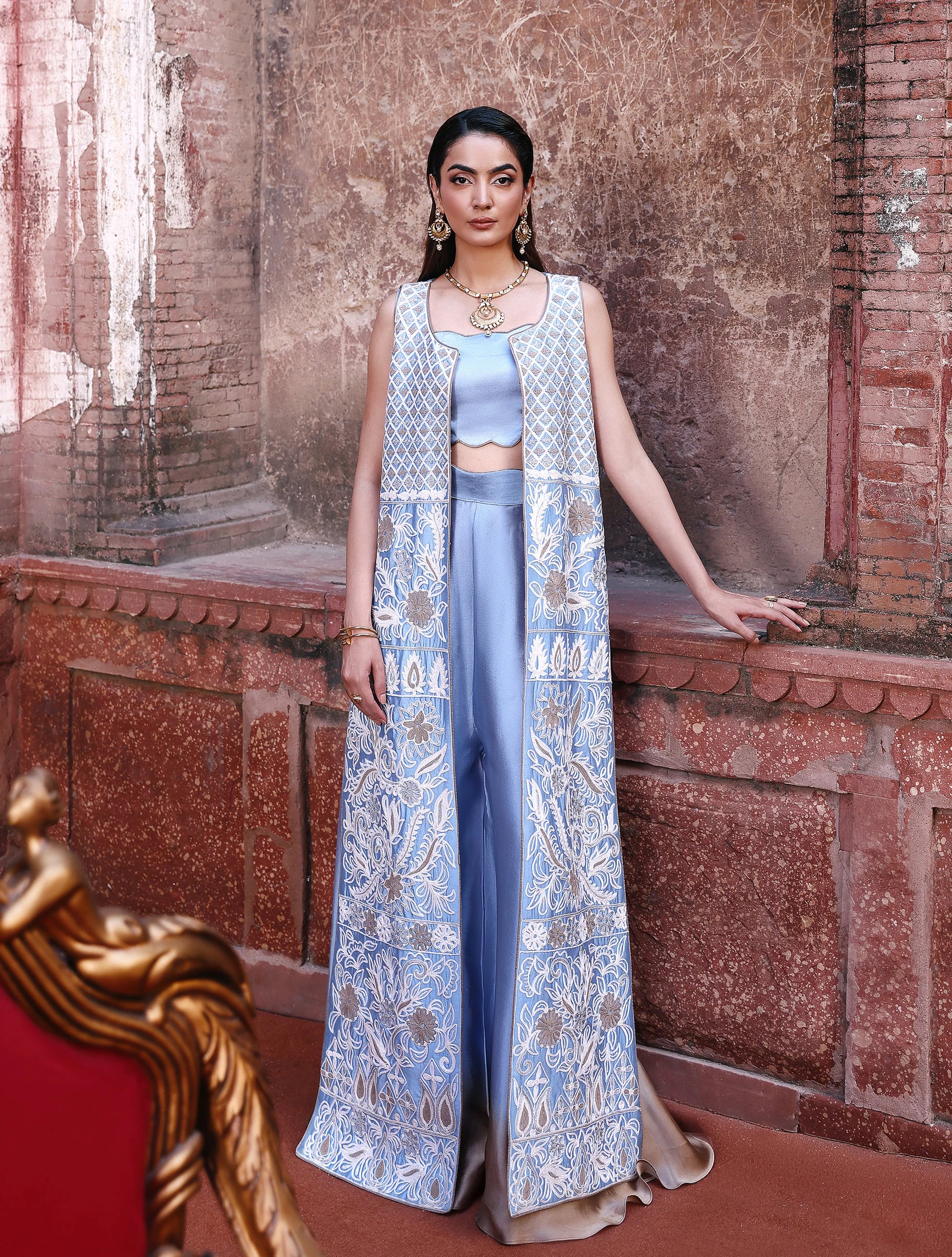 Bluewood crafted from premium silk, this elegant long silhouette is adorned with intricate ivory and brown dori work and tilla detailing, paired with flared pants to create a look that exudes timeless sophistication and modern charm.