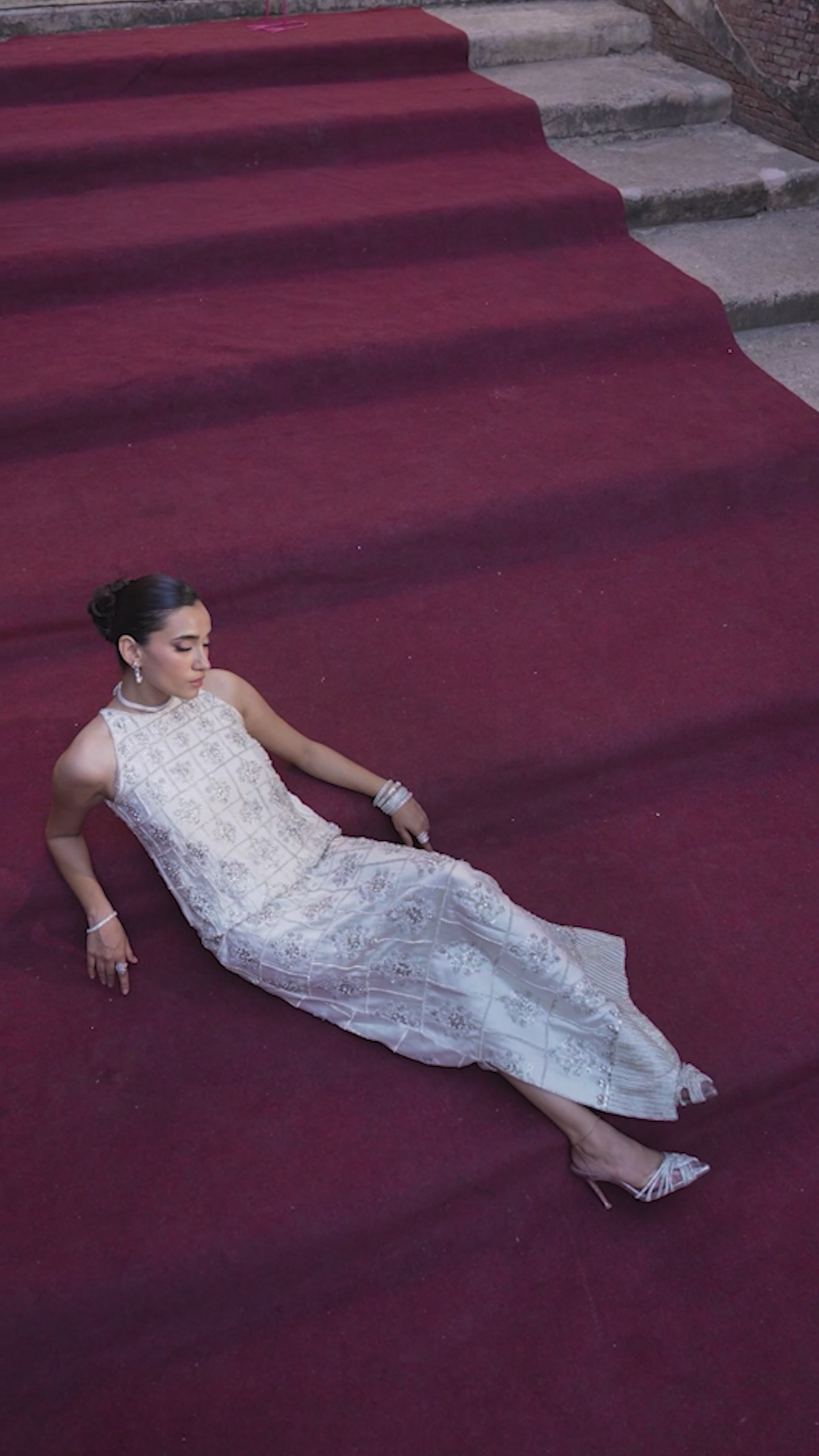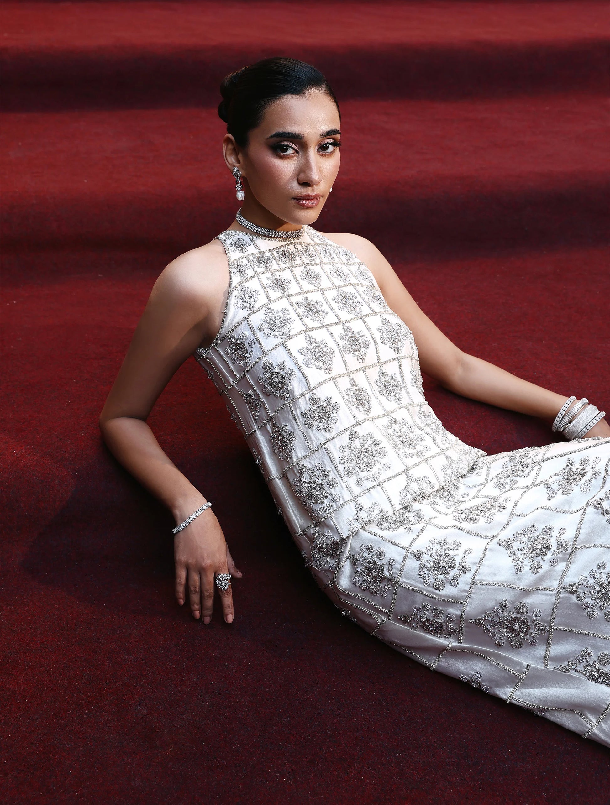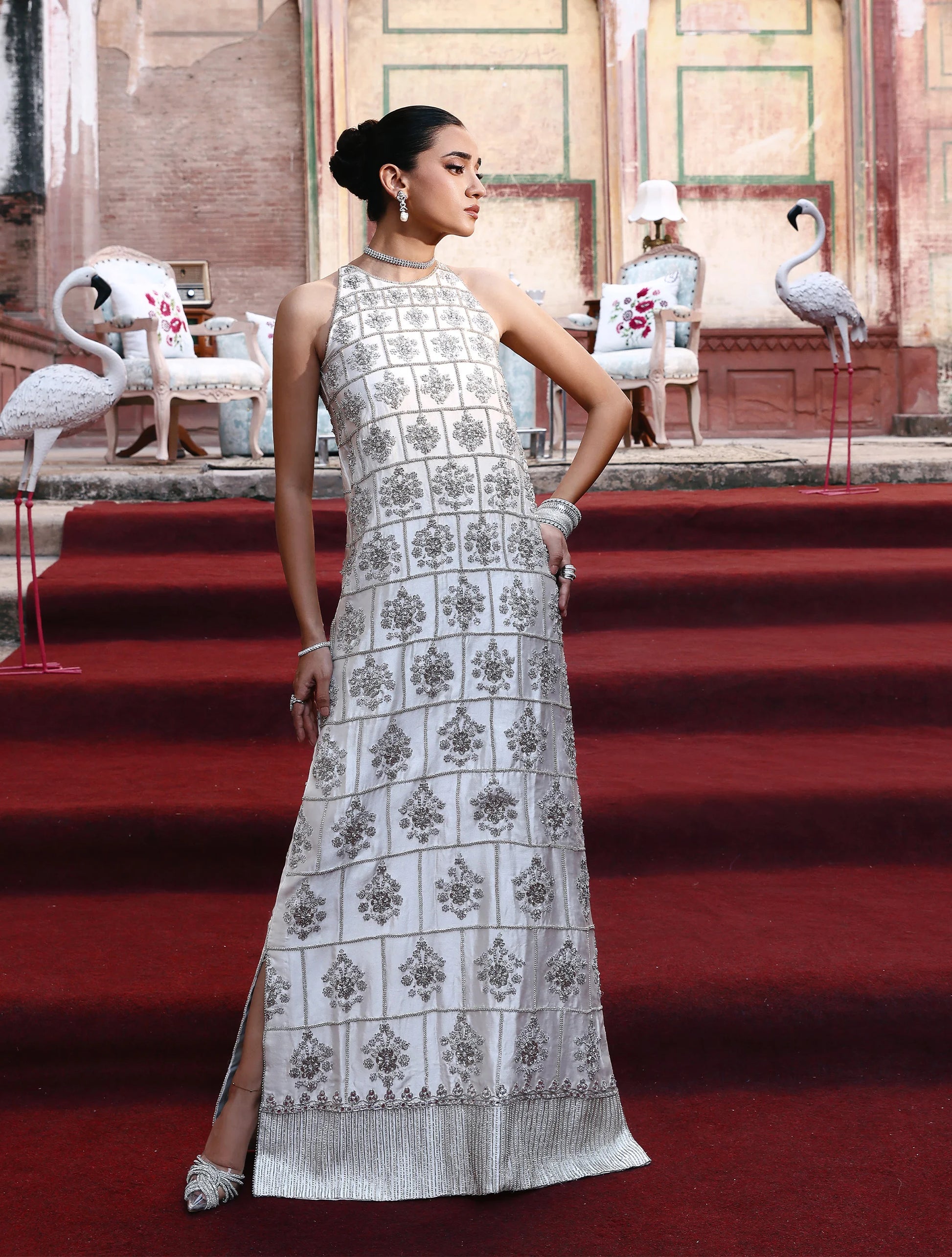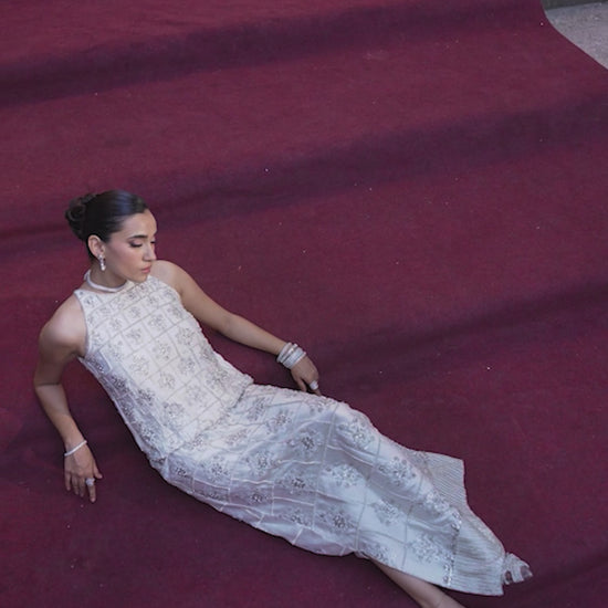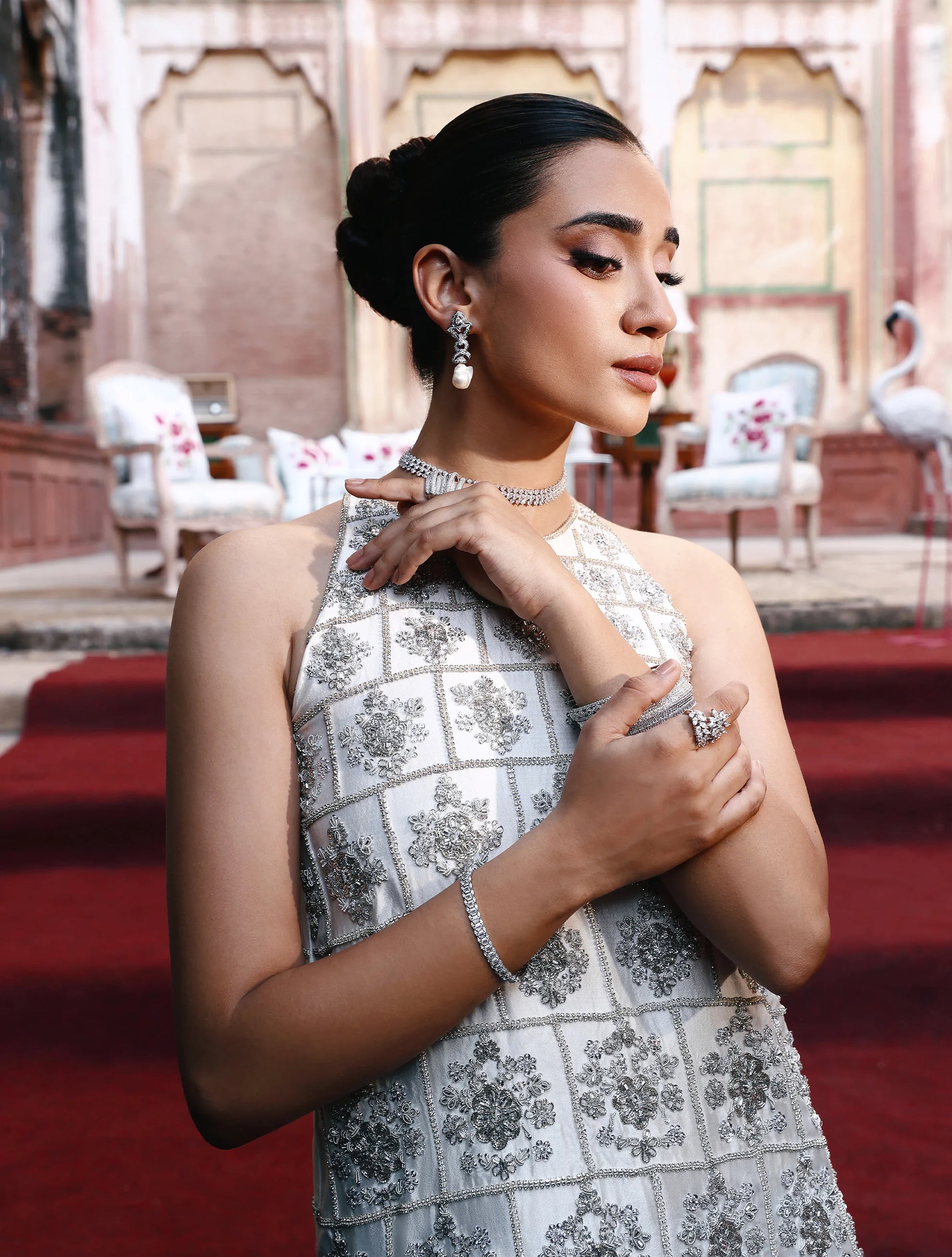 An ethereal ensemble in a pristine snow white hue, exuding timeless grace and sophistication. The outfit is adorned with exquisite silver handwork, featuring intricate nakshi, batki, crystal, and stone embellishments that shimmer delicately under the light. Each detail is handcrafted with meticulous precision, creating a luminous, shimmery aura that captures the essence of luxury. The silver embellishments dance across the fabric in elegant patterns, giving the outfit a regal yet contemporary charm — perfect for a wedding, formal soirée, or festive celebration.